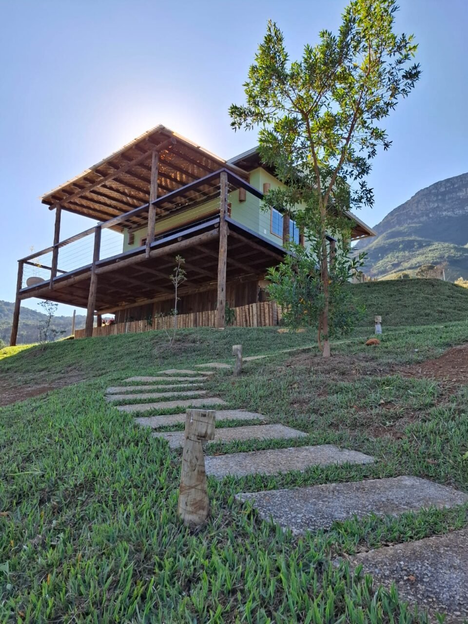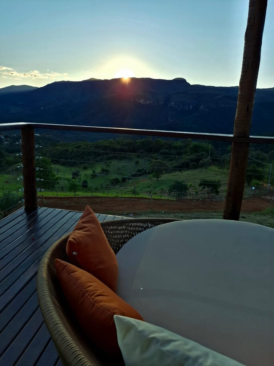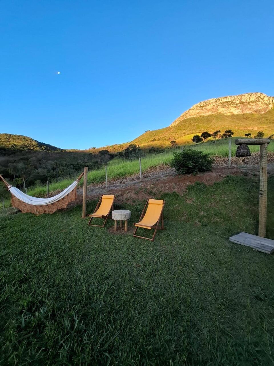 - Área externa com rede, espreguiçadeiras, mesa de apoio e ducha.