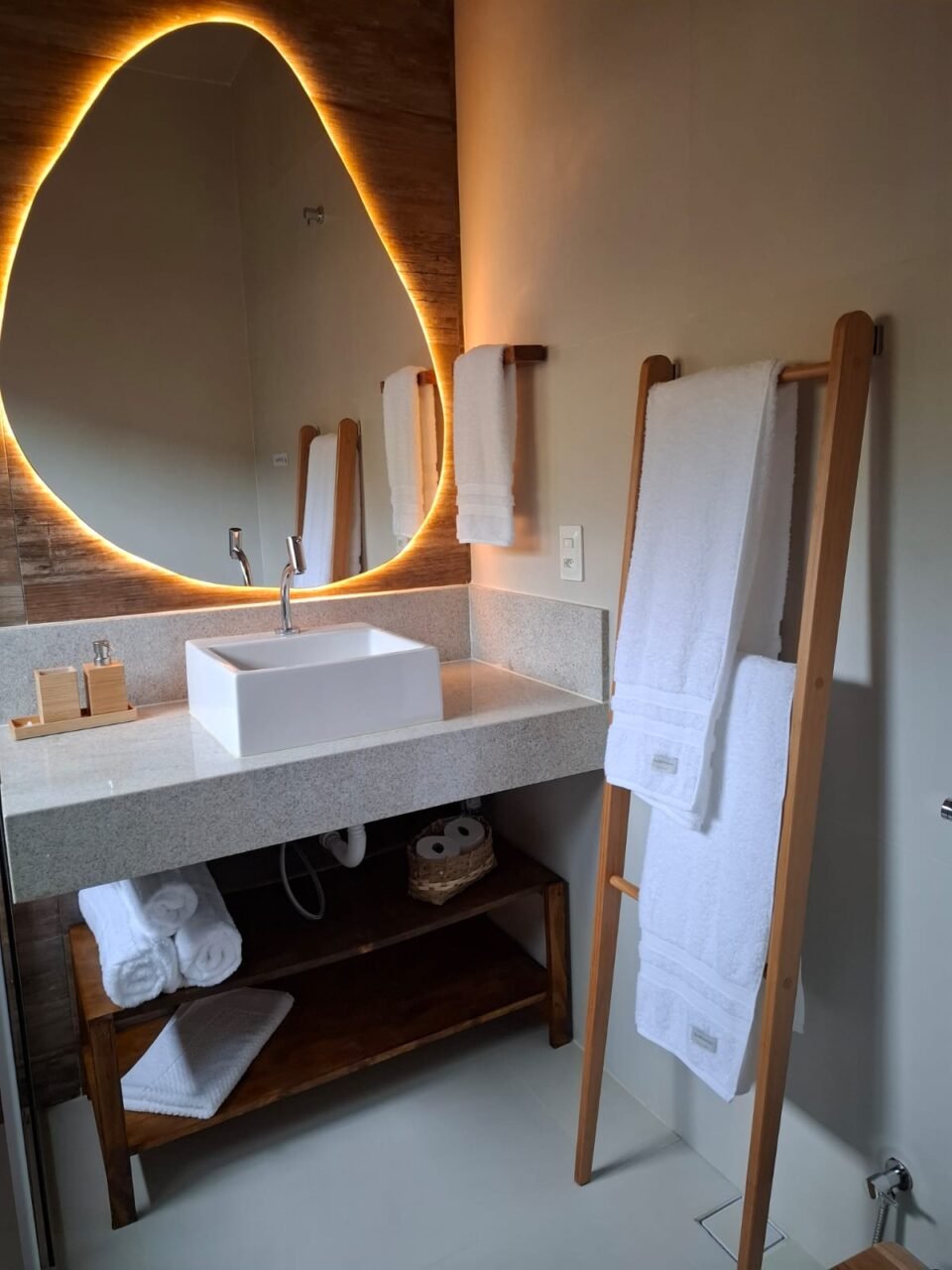 - Quarto com cama Queen Size, mesa de cabeceira, ar condicionado (quente/frio), arara com cabideiro e prateleiras.