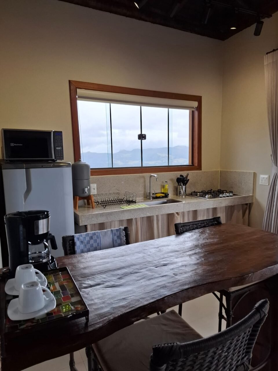 - Cozinha com mesa (península) e banquetas, geladeira, micro-ondas, cooktop, air fry, mixer, cafeteira, misteira e filtro de barro.